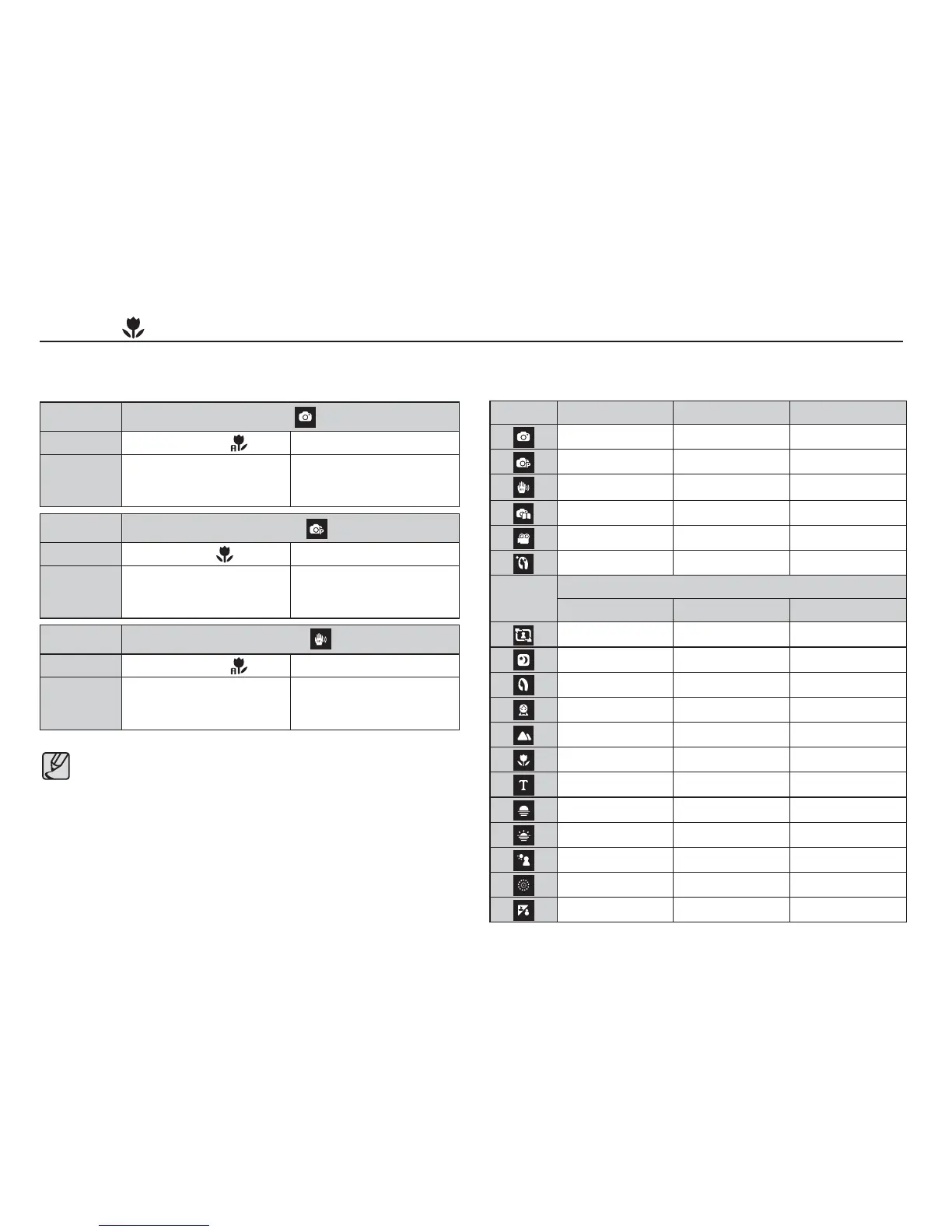 Types of focus mode and focus range (W : Wide, T : Tele)