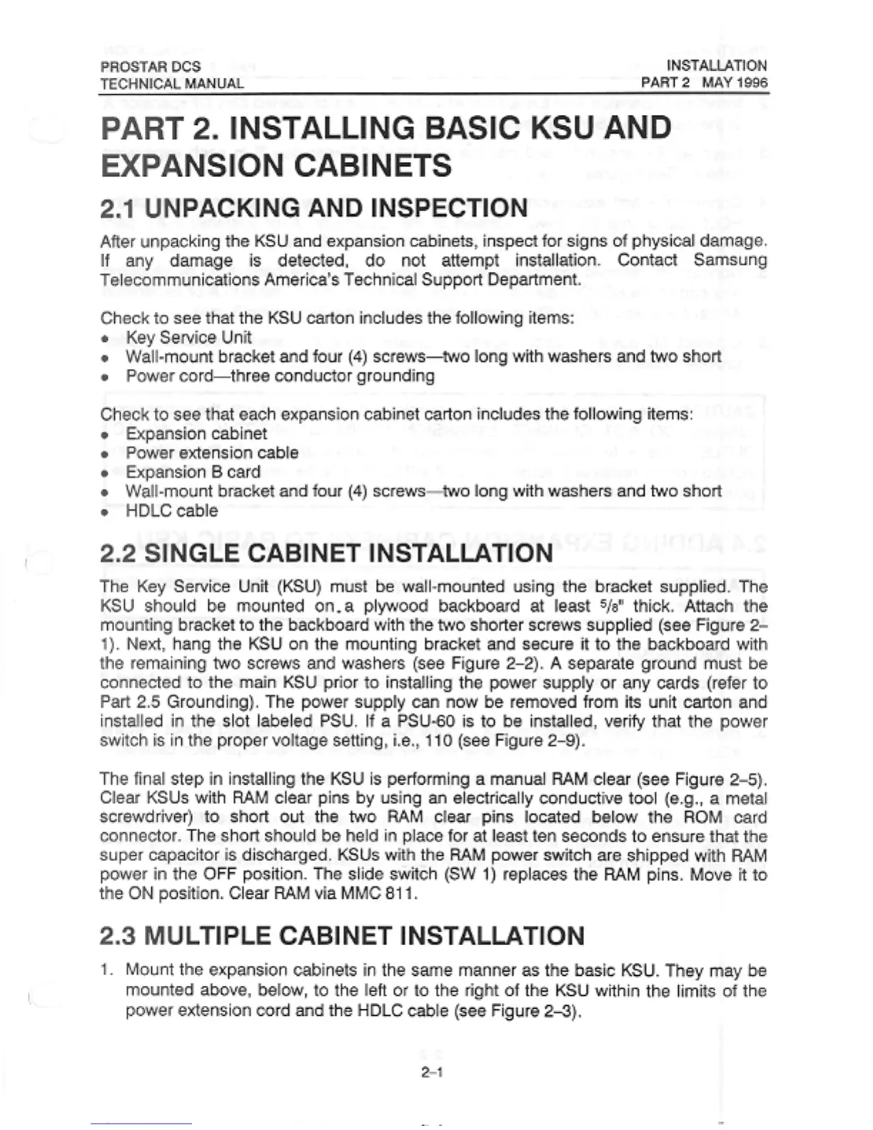 Samsung Prostar DCS - Installing Basic KSU and Expansion Cabinets; Unpacking and Inspection; Single Cabinet Installation; Multiple Cabinet Installation