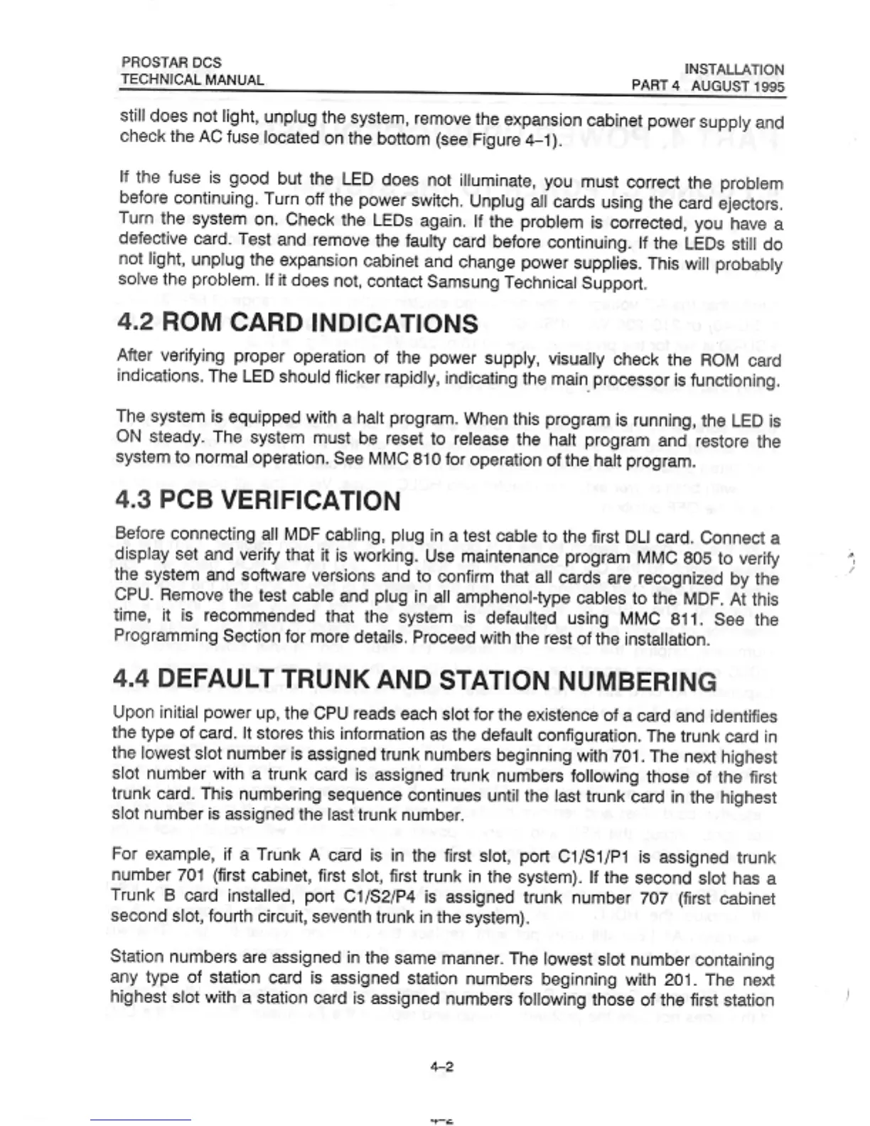 Samsung Prostar DCS - ROM Card Indications; PCB Verification; Default Trunk and Station Numbering