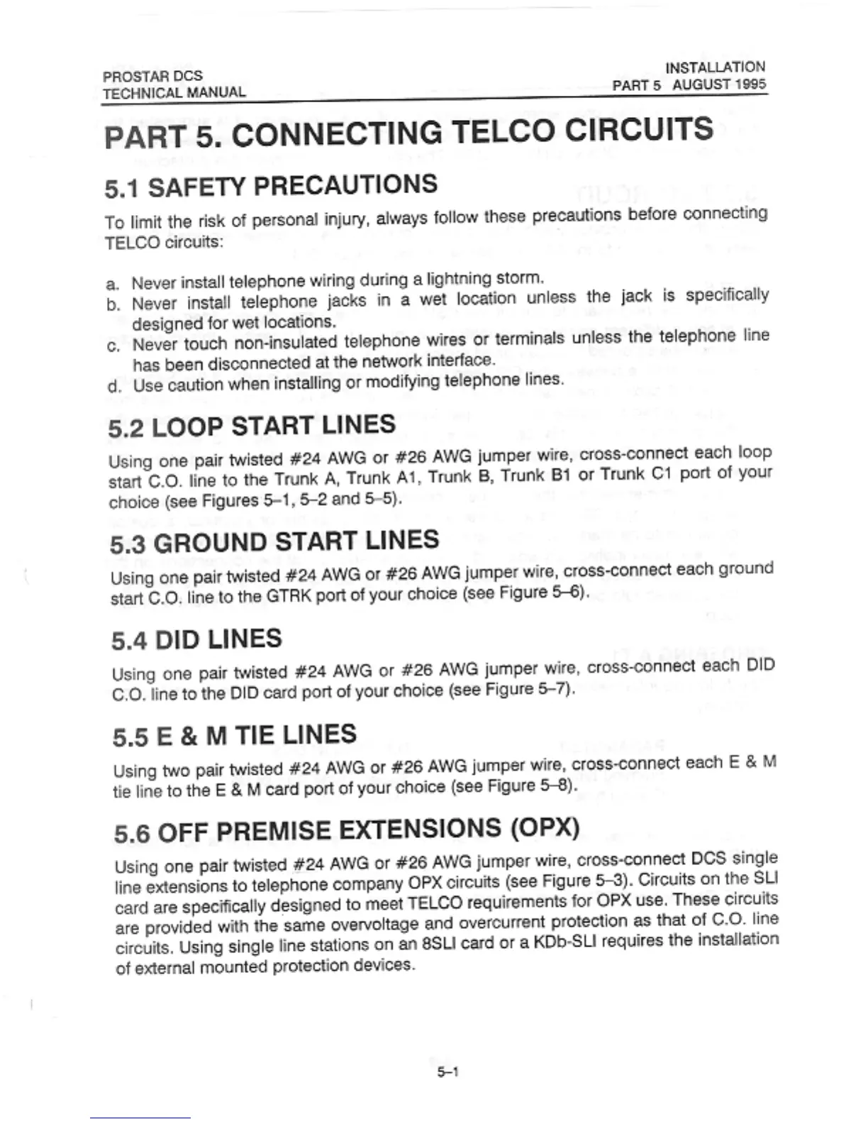 Samsung Prostar DCS - Connecting TELCO Circuits; Safety Precautions; Loop Start Lines; Ground Start Lines