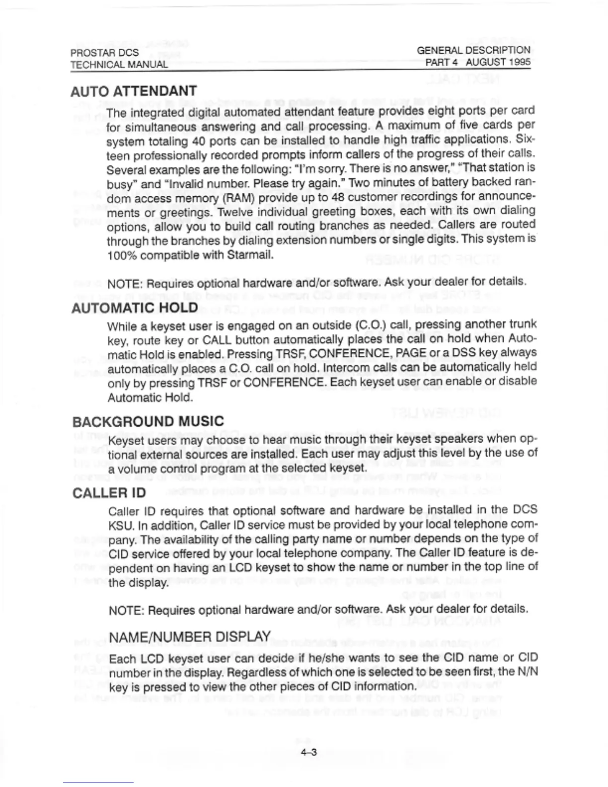 Samsung Prostar DCS - Automatic Hold; Background Music; Caller ID; Name;Number Display