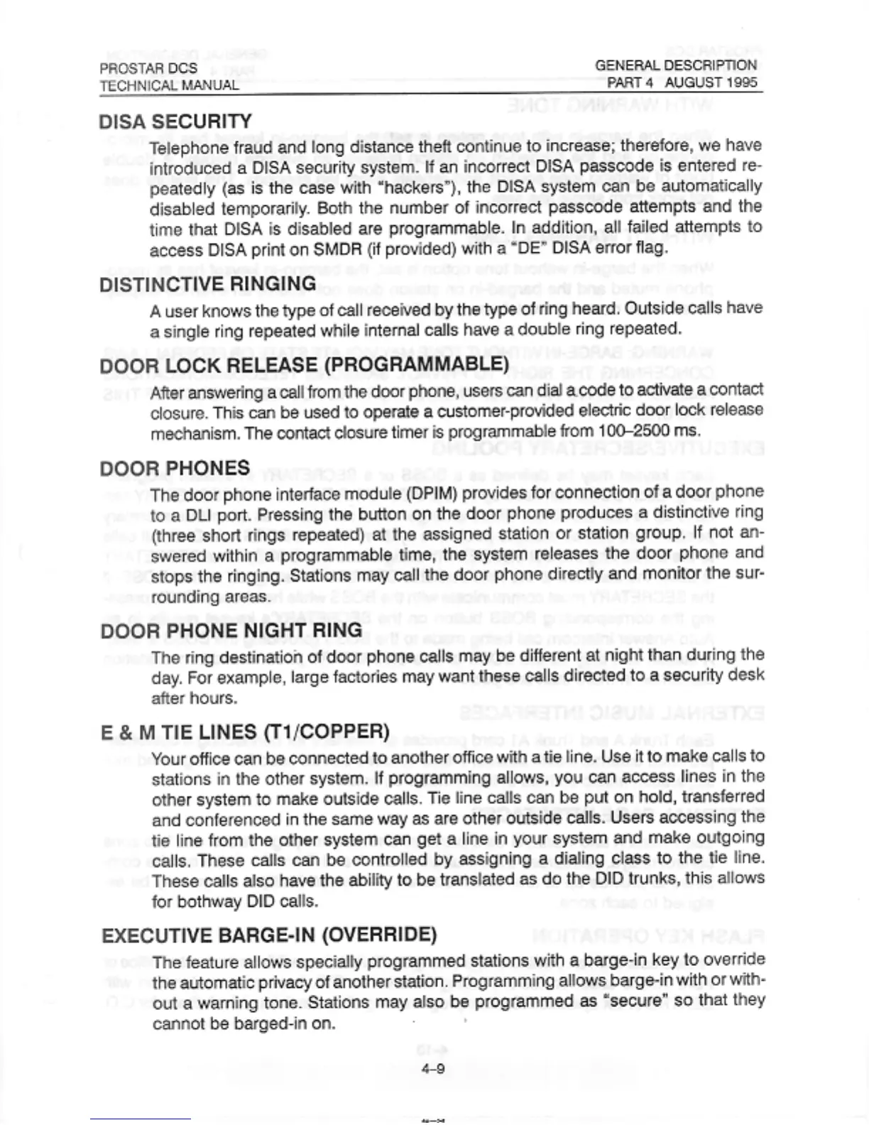 Samsung Prostar DCS - DISA Security; Distinctive Ringing; Door Lock Release (Programmable); Door Phones