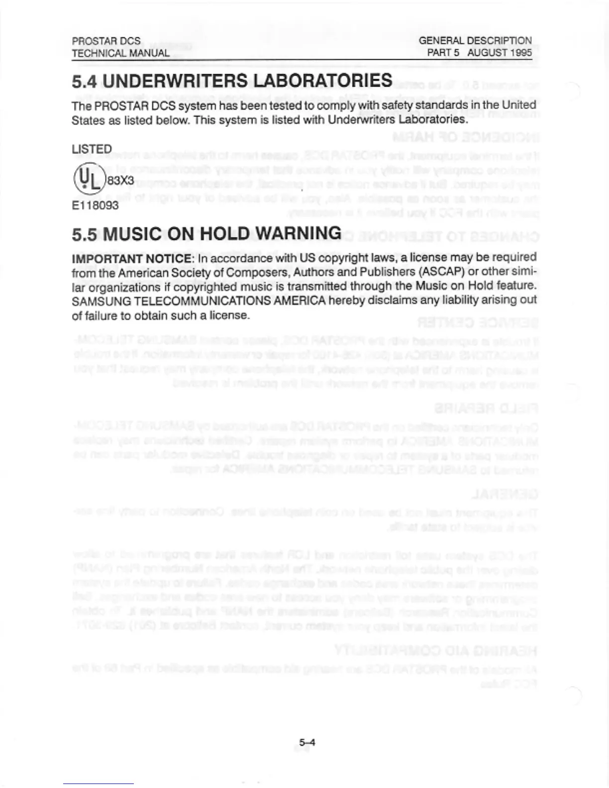 Samsung Prostar DCS - Underwriters Laboratories; Music on Hold Warning