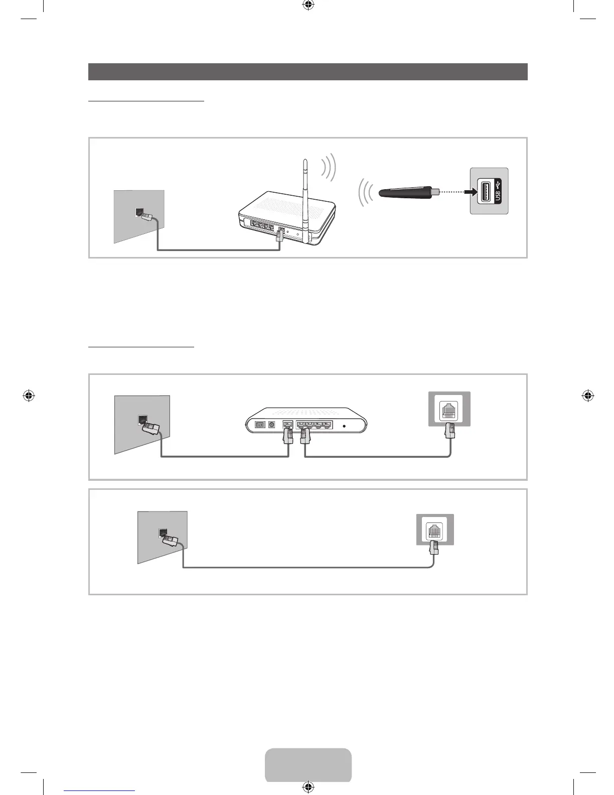 There are two main ways to connect your TV to your network using cable, depending on your network setup. They are illustrated