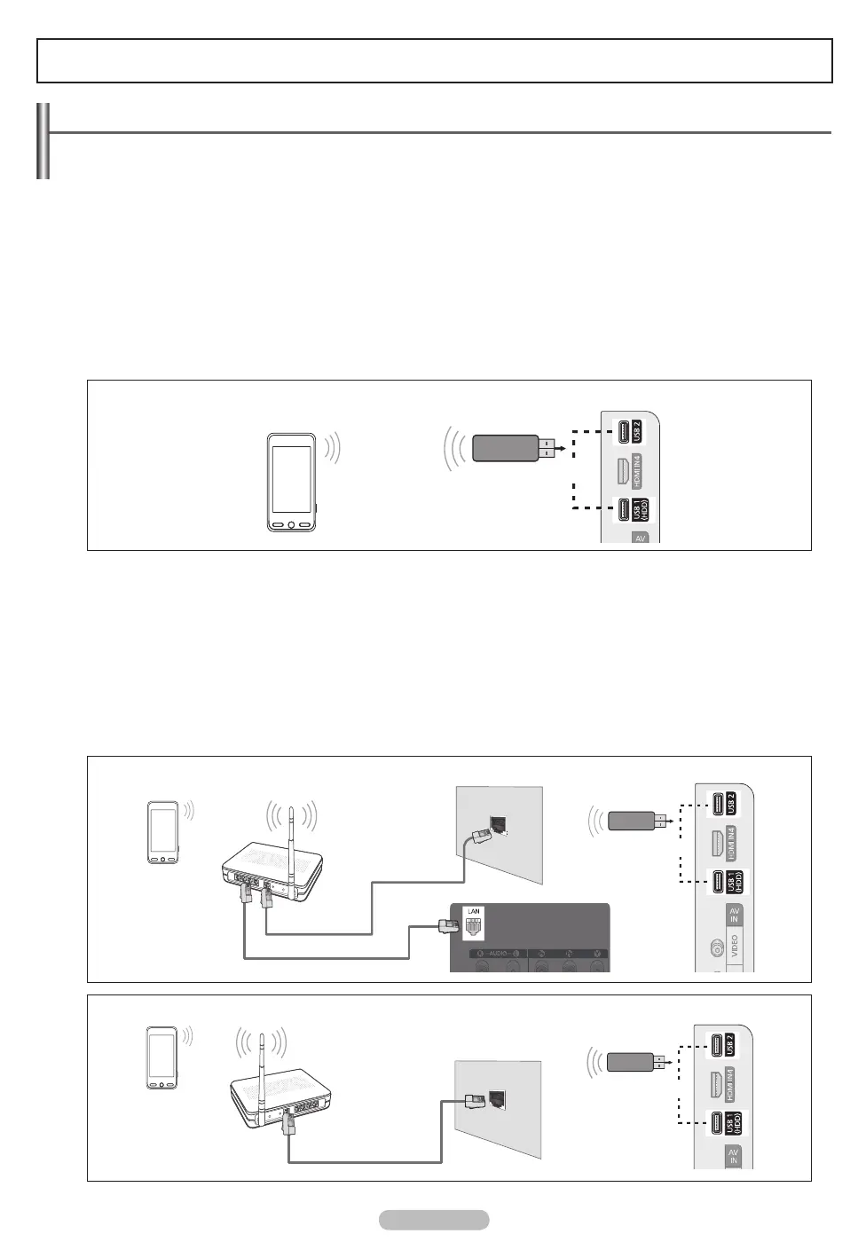 1. Connect the LAN port of the TV and the Wire/Wireless IP sharer using the LAN cable or connect the USB1(HDD) or USB2 port