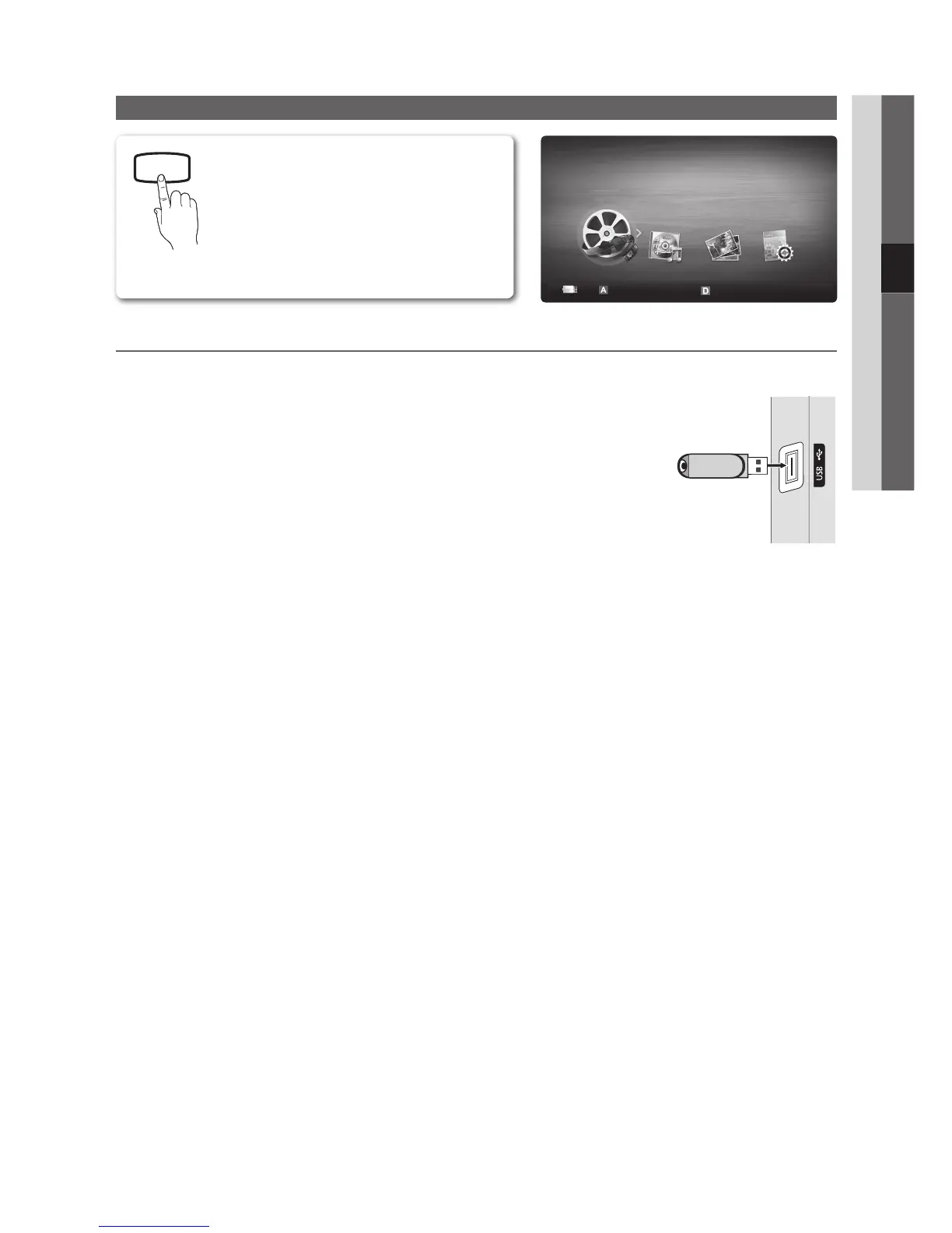 2. Connect a USB device containing photo, music and/or movie fi les to the