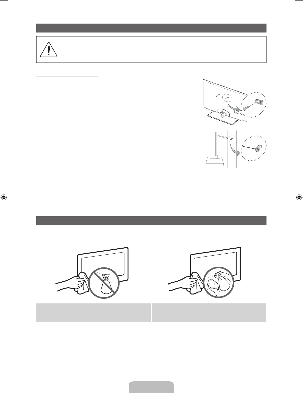 Caution: Pulling, pushing, or climbing onto the TV may cause the TV to fall. In particular, ensure