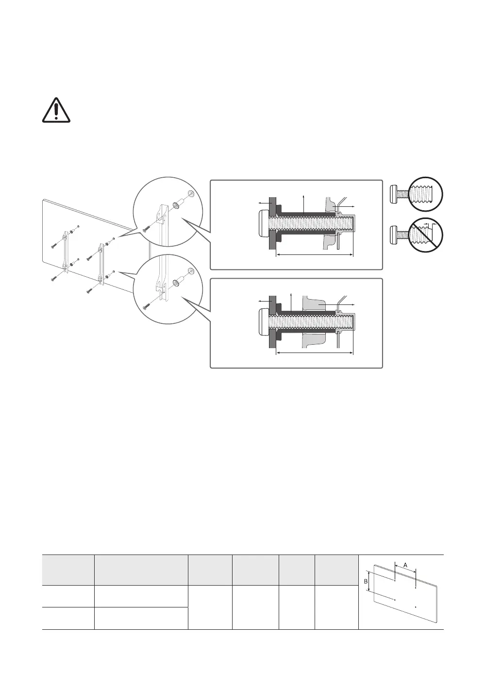 • If you want to install a wall mount kit that attaches to the wall using two top screws only, be sure to use a Samsung