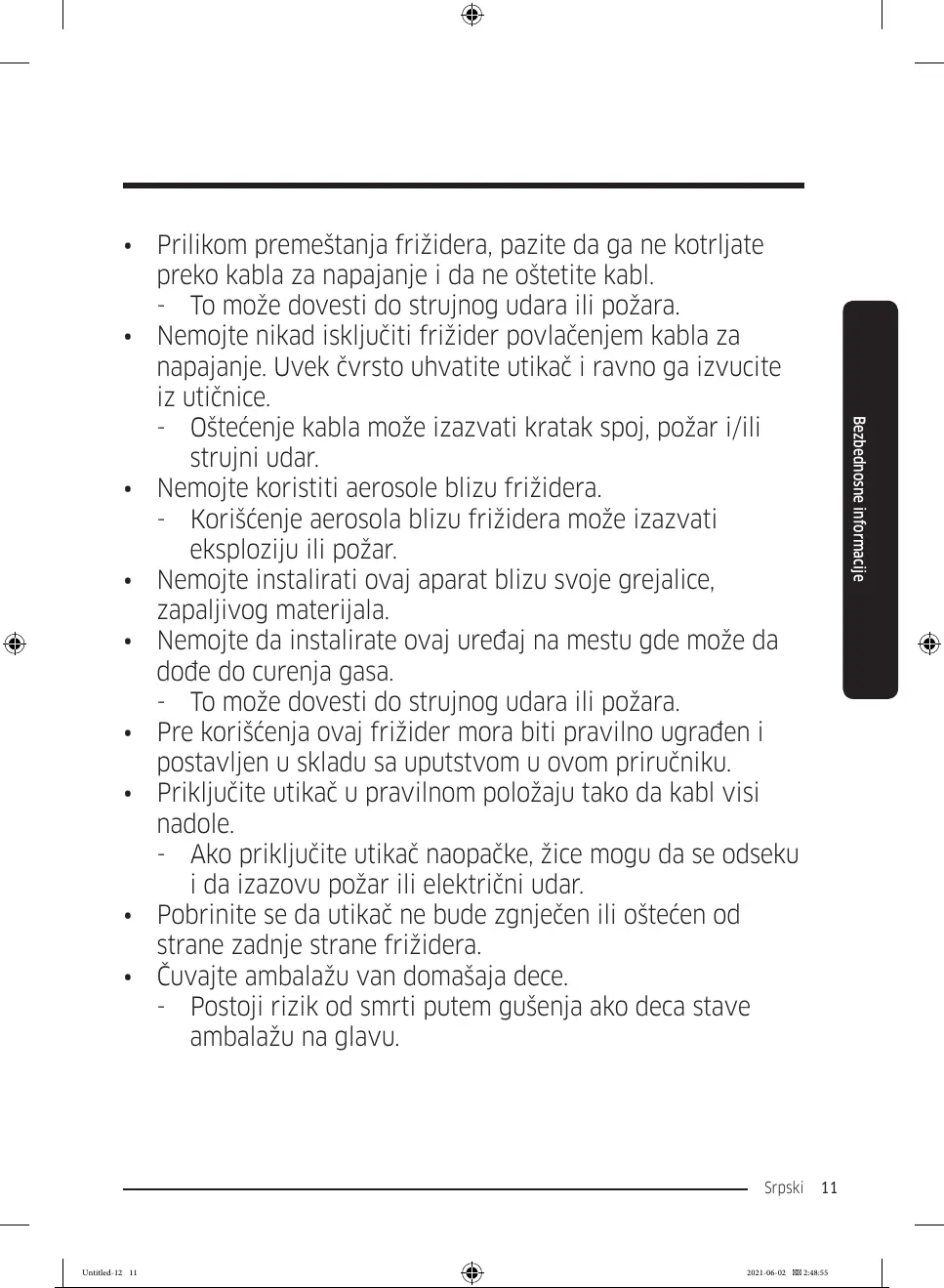 - Oštećenje kabla može izazvati kratak spoj, požar i/ili