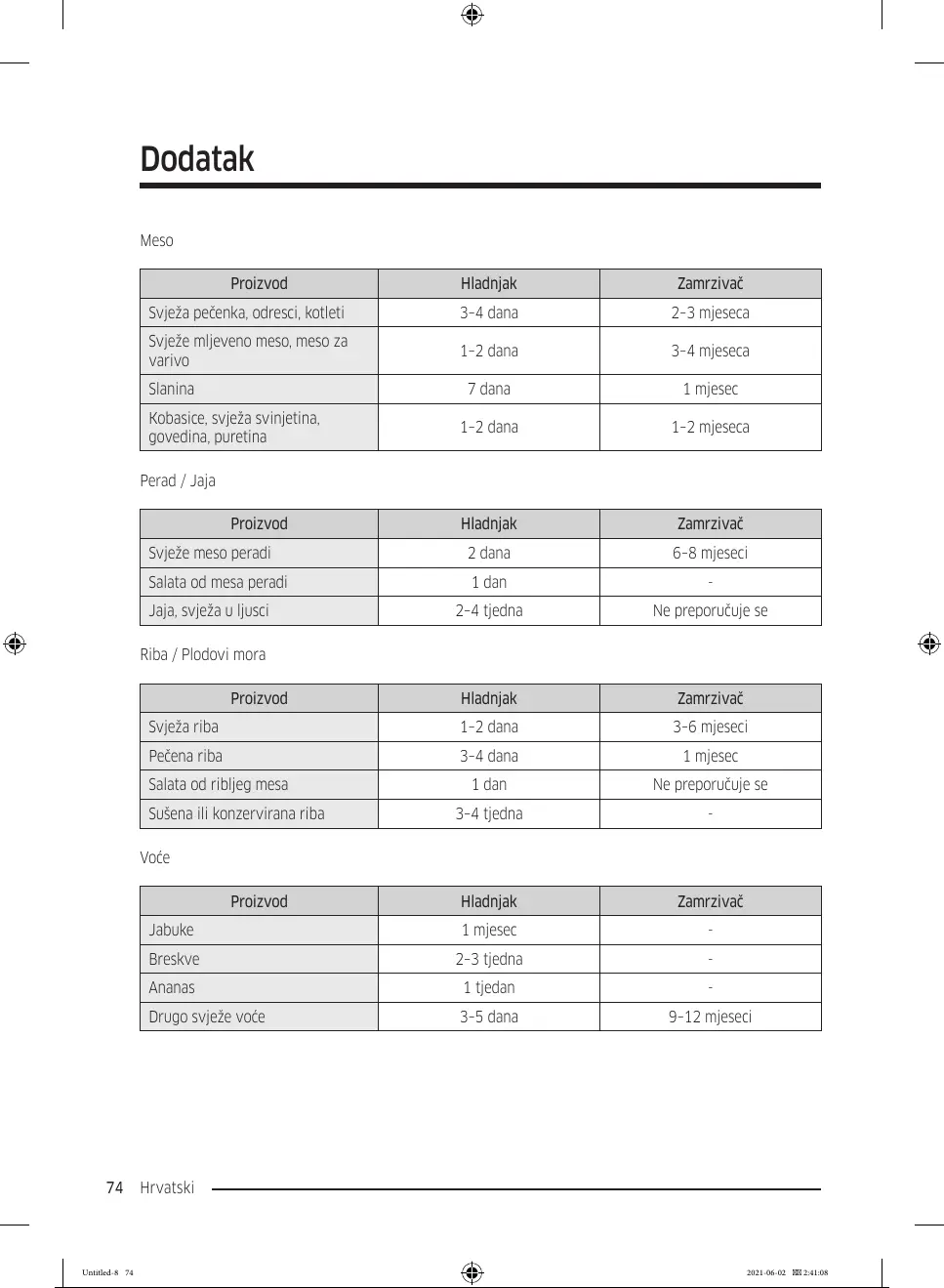 Svježe meso peradi 2 dana 6–8 mjeseci