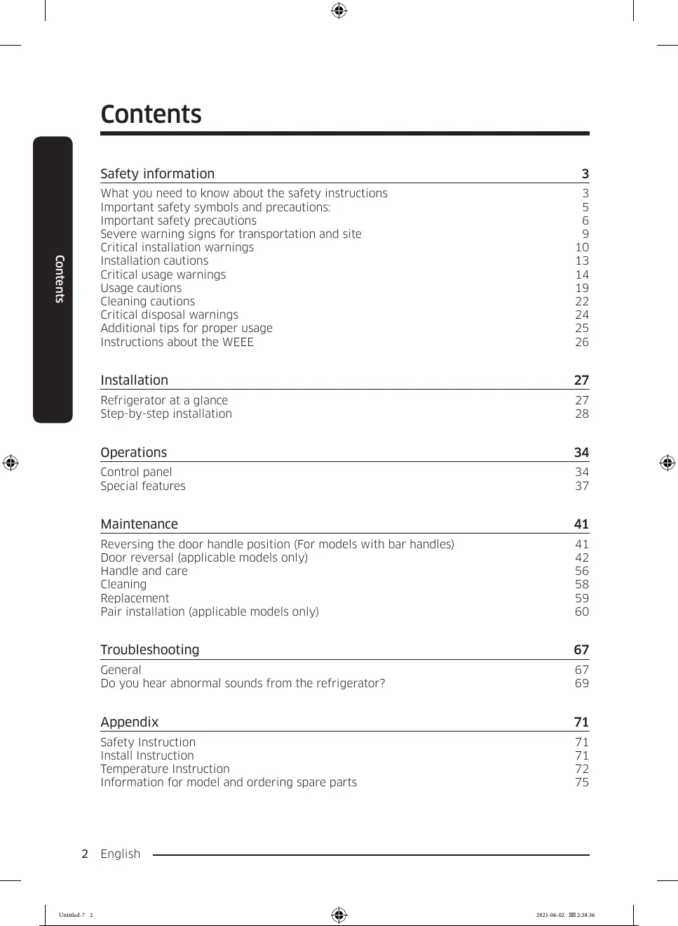 Reversing the door handle position (For models with bar handles) 41
