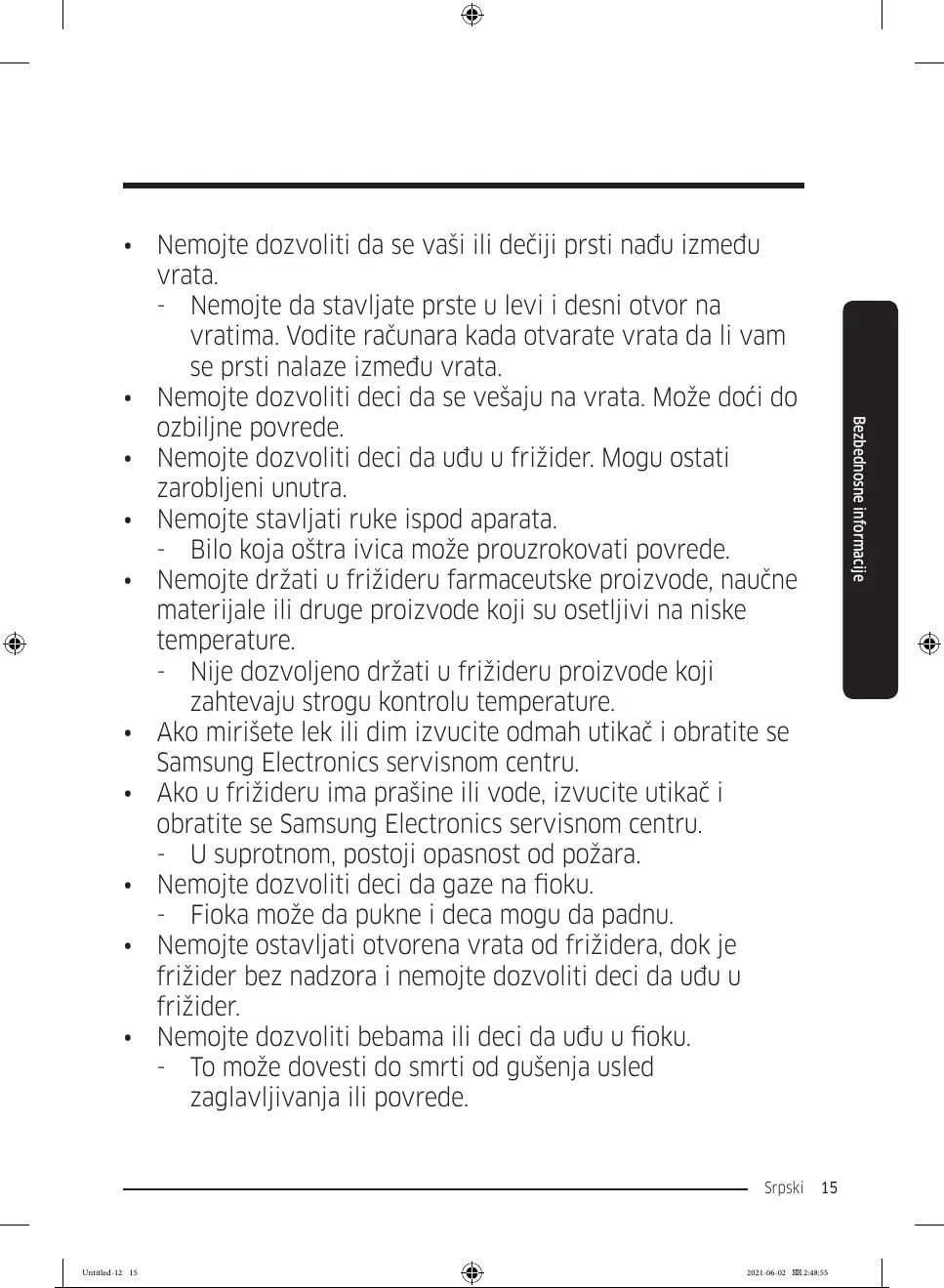 • Nemojte dozvoliti da se vaši ili dečiji prsti nađu između