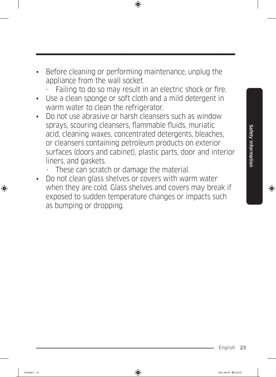 • Do not clean glass shelves or covers with warm water