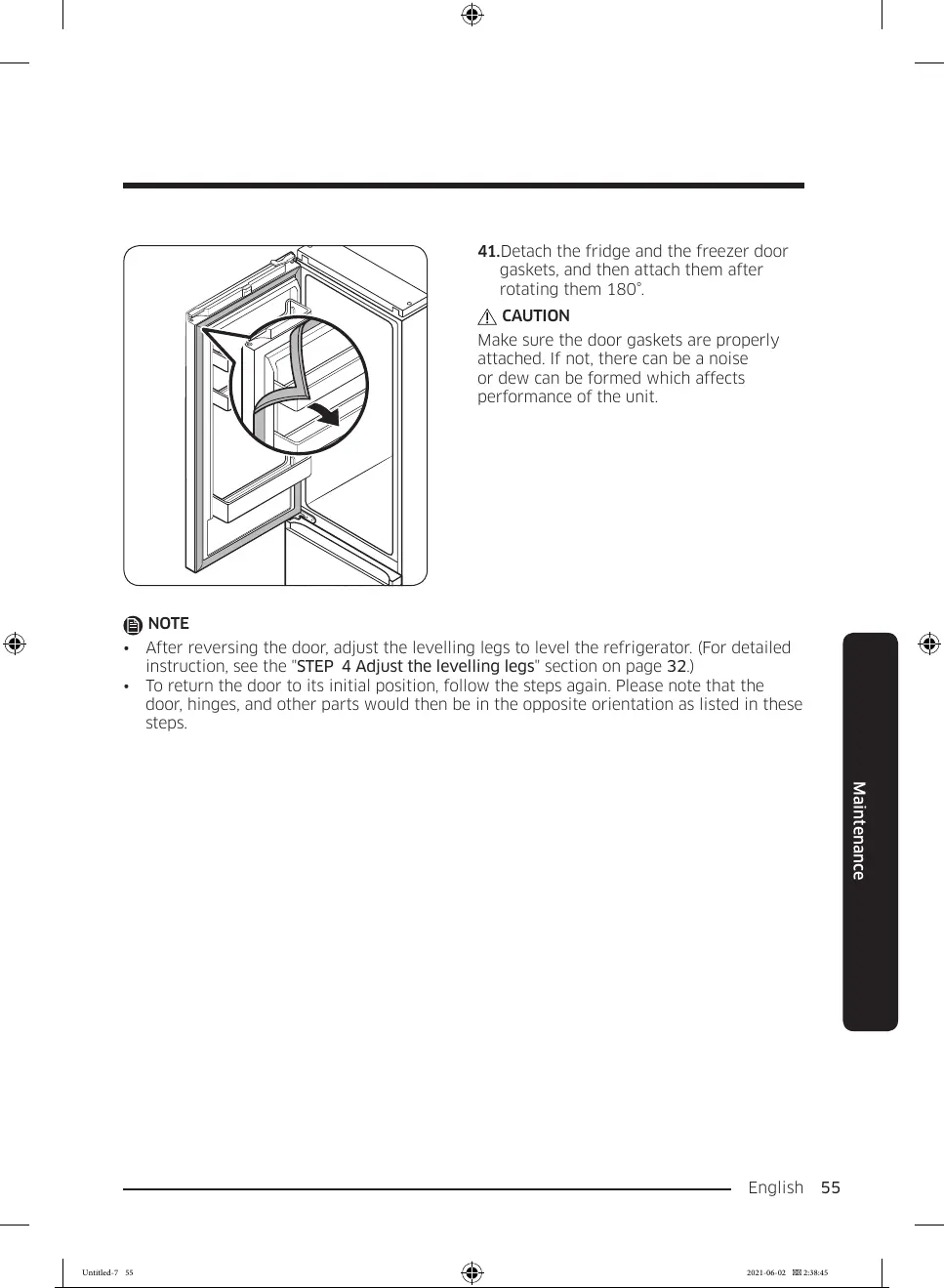 • After reversing the door, adjust the levelling legs to level the refrigerator. (For detailed