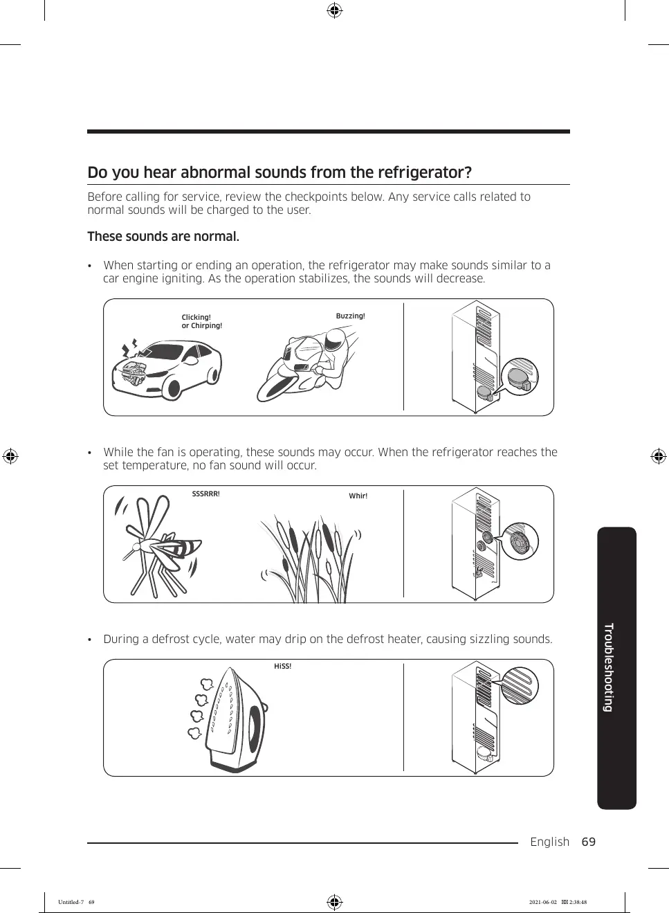 • While the fan is operating, these sounds may occur. When the refrigerator reaches the