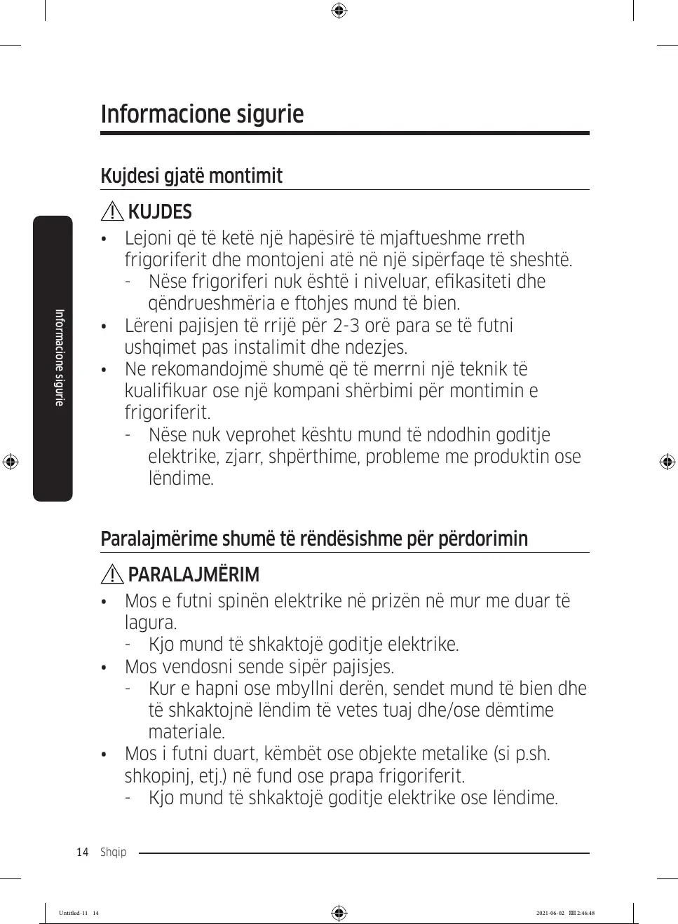 - Kjo mund të shkaktojë goditje elektrike ose lëndime.