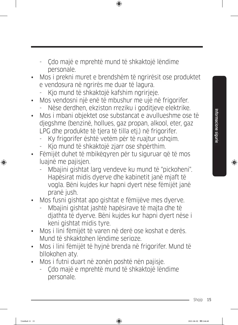 • Mos i lini fëmijët të hyjnë brenda në frigorifer. Mund të