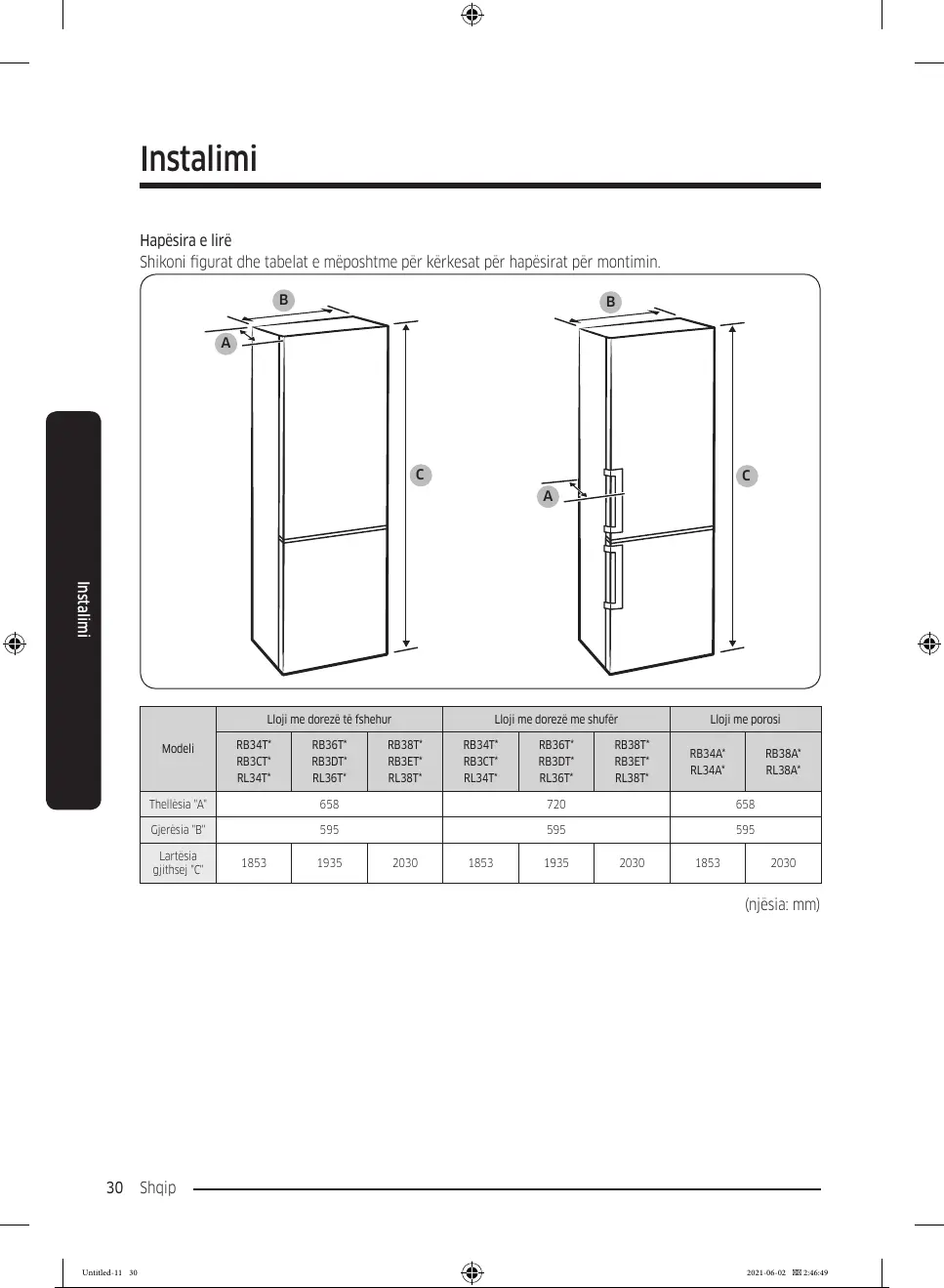 Shikoni gurat dhe tabelat e mëposhtme për kërkesat për hapësirat për montimin.