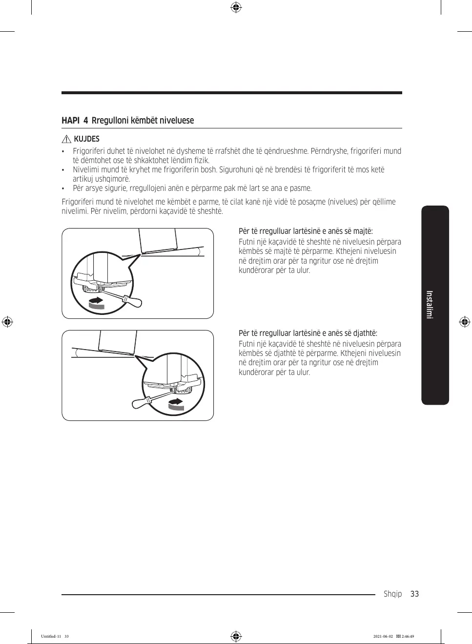 • Nivelimi mund të kryhet me frigoriferin bosh. Sigurohuni që në brendësi të frigoriferit të mos ketë
