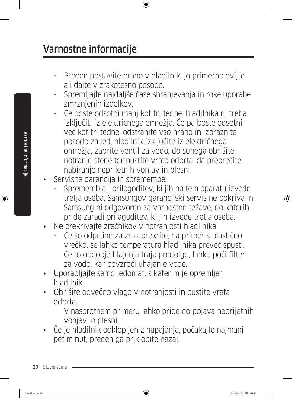 - Če boste odsotni manj kot tri tedne, hladilnika ni treba