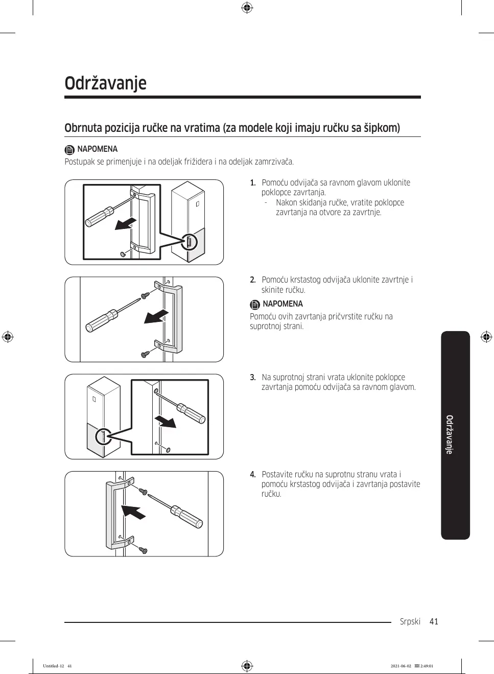 Obrnuta pozicija ručke na vratima (za modele koji imaju ručku sa šipkom)