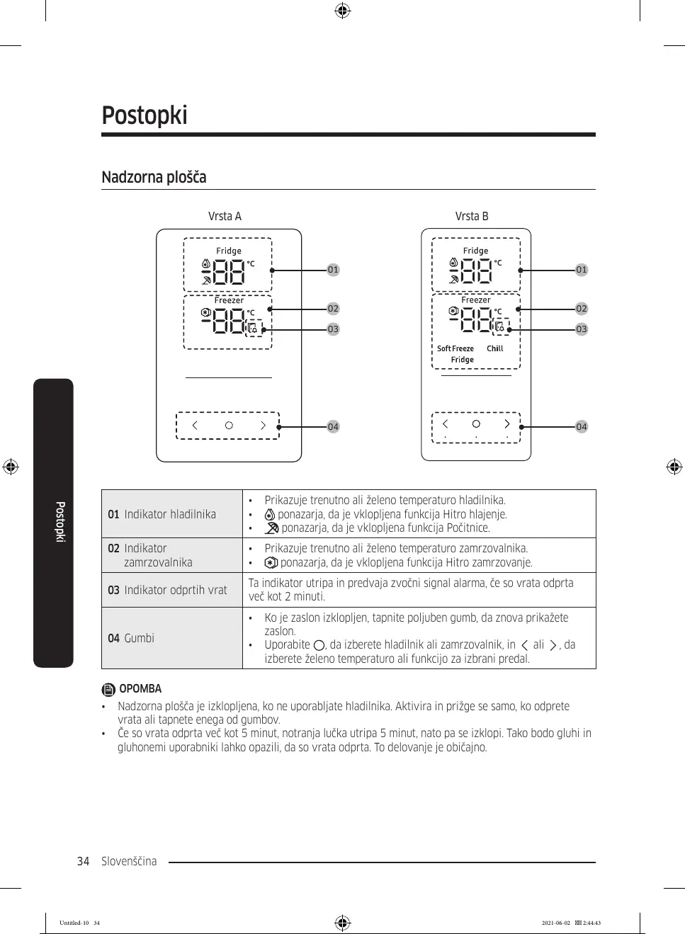• Nadzorna plošča je izklopljena, ko ne uporabljate hladilnika. Aktivira in prižge se samo, ko odprete