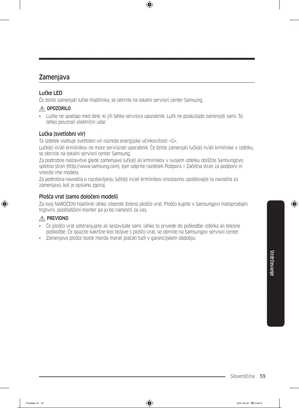 poškodbe. Če opazite kakršne koli težave s ploščo vrat, se obrnite na Samsungov servisni center.