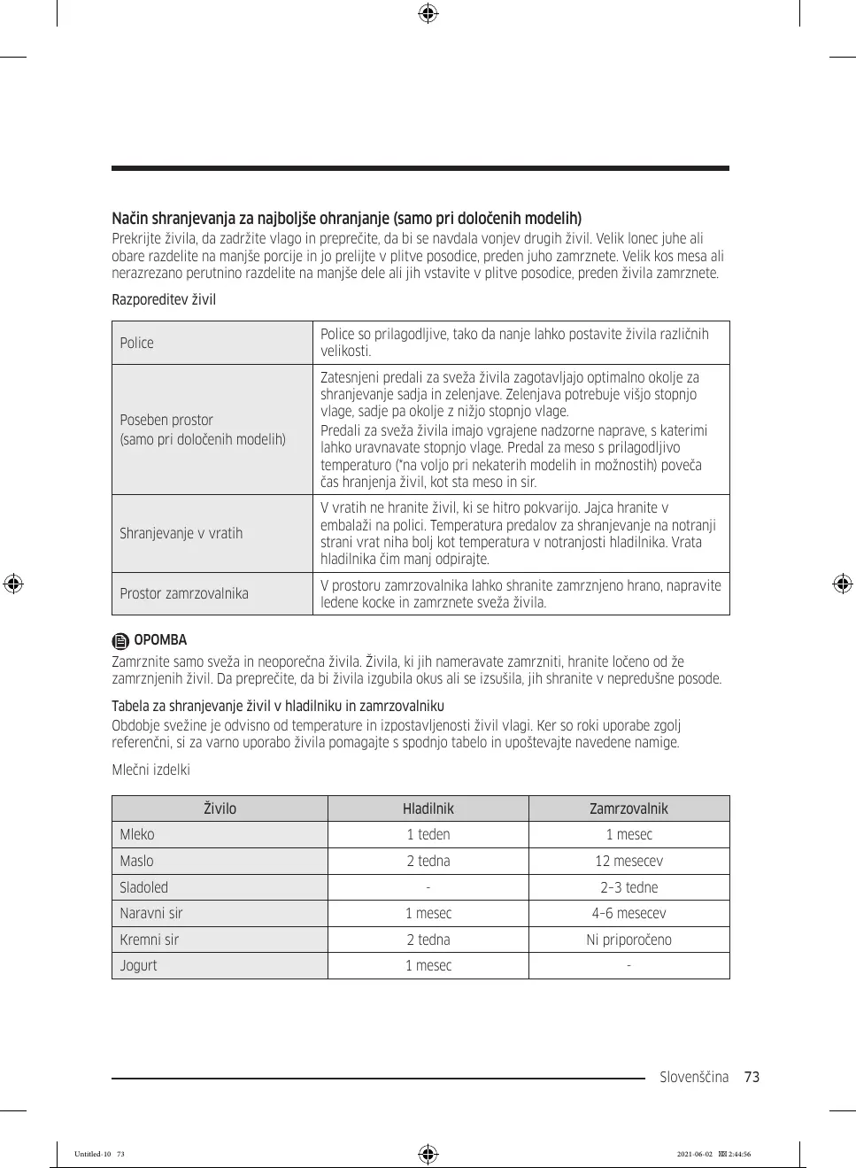 Tabela za shranjevanje živil v hladilniku in zamrzovalniku