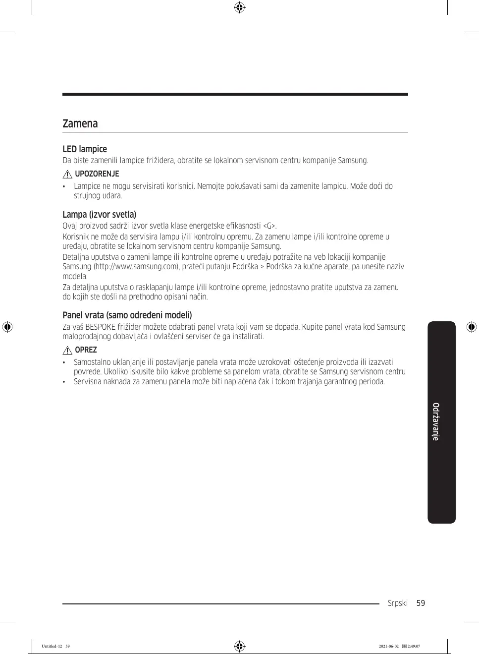 povrede. Ukoliko iskusite bilo kakve probleme sa panelom vrata, obratite se Samsung servisnom centru