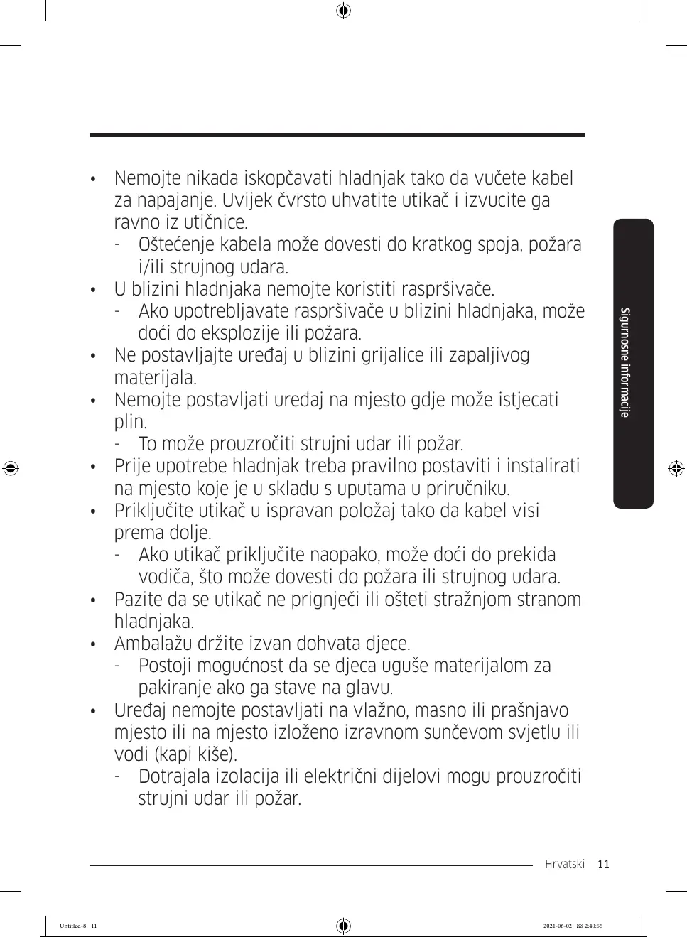 • Nemojte nikada iskopčavati hladnjak tako da vučete kabel