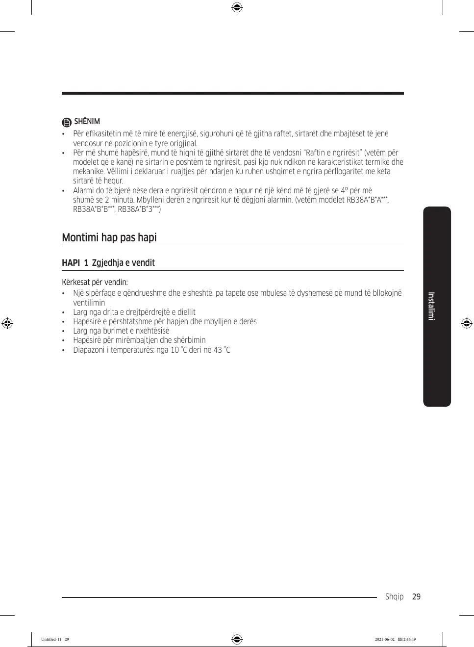 • Hapësirë e përshtatshme për hapjen dhe mbylljen e derës