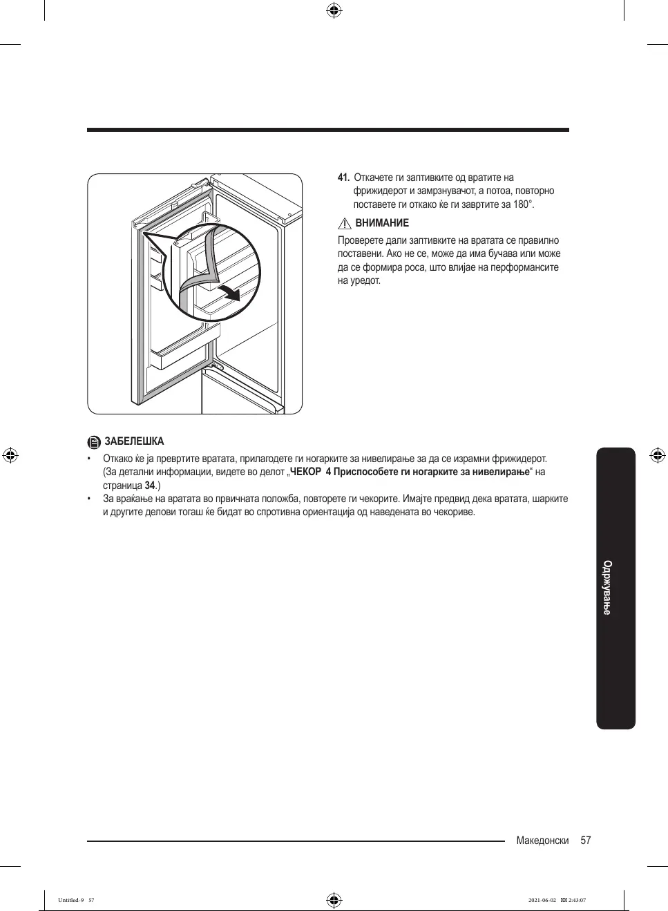 • Откакоќејапревртитевратата,прилагодетегиногаркитезанивелирањезадасеизрамнифрижидерот.