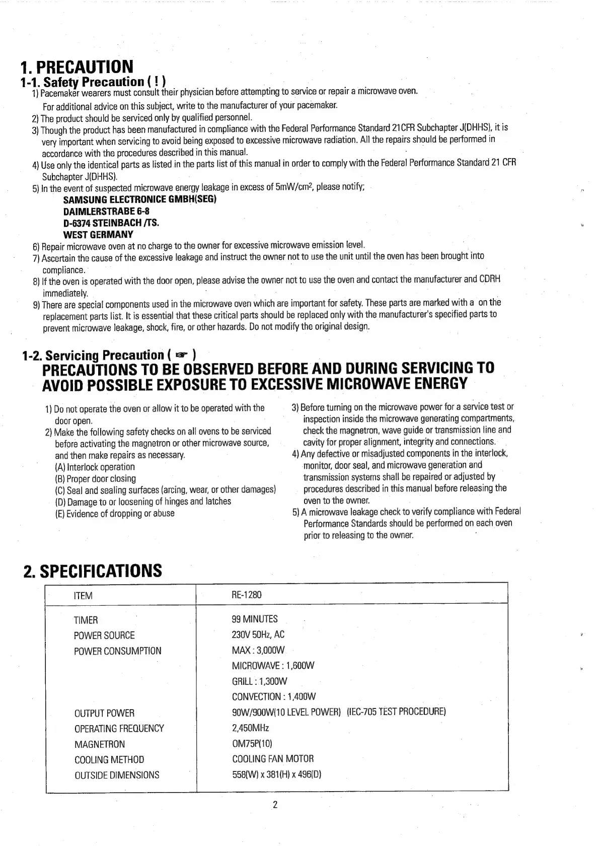 Samsung RE-1280 - Precautions to be Observed before and During Servicing to Avoid Possible Exposure to Excessive Microwave Energy; Specifications