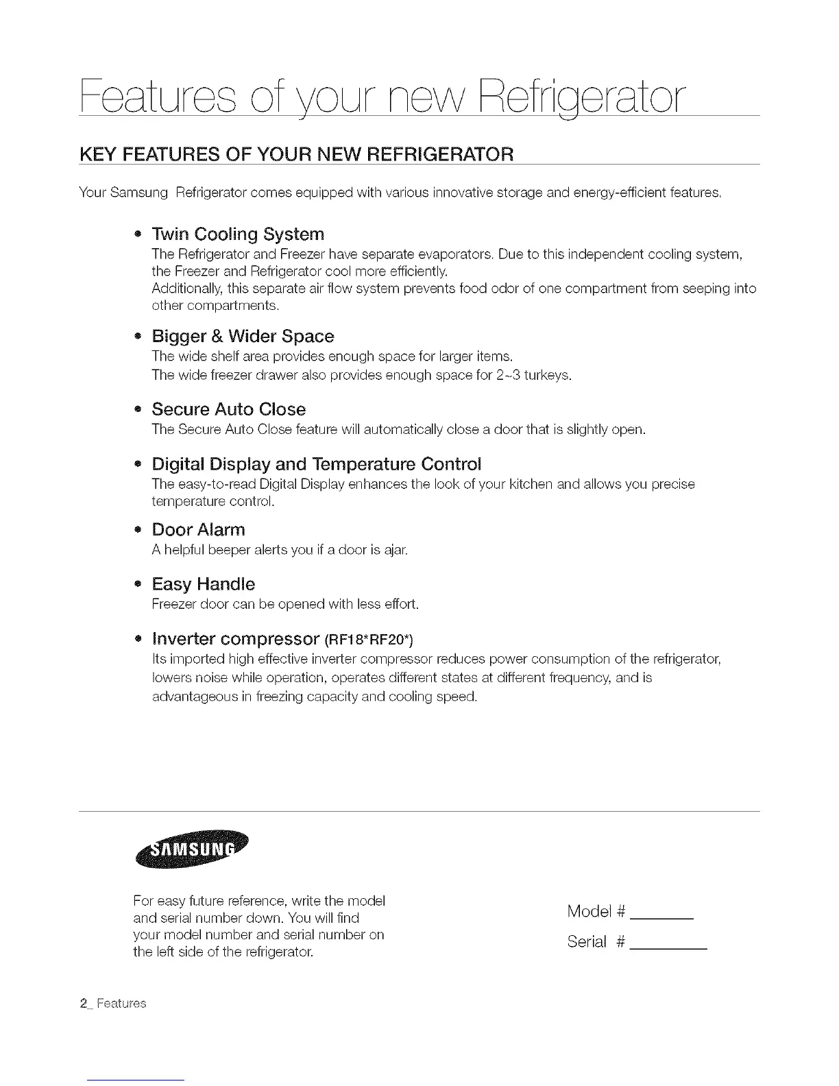 KEY FEATURES OF YOUR NEW REFRIGERATOR