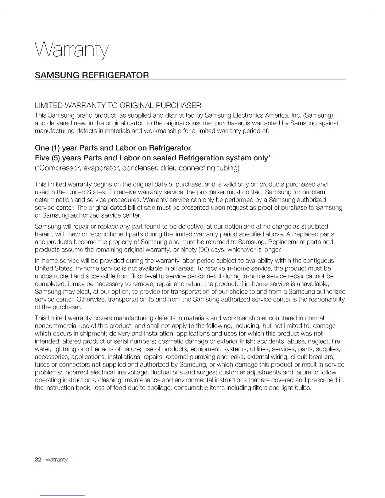 used in the United States. To receive warranty service, the purchaser must contact Samsung for problem