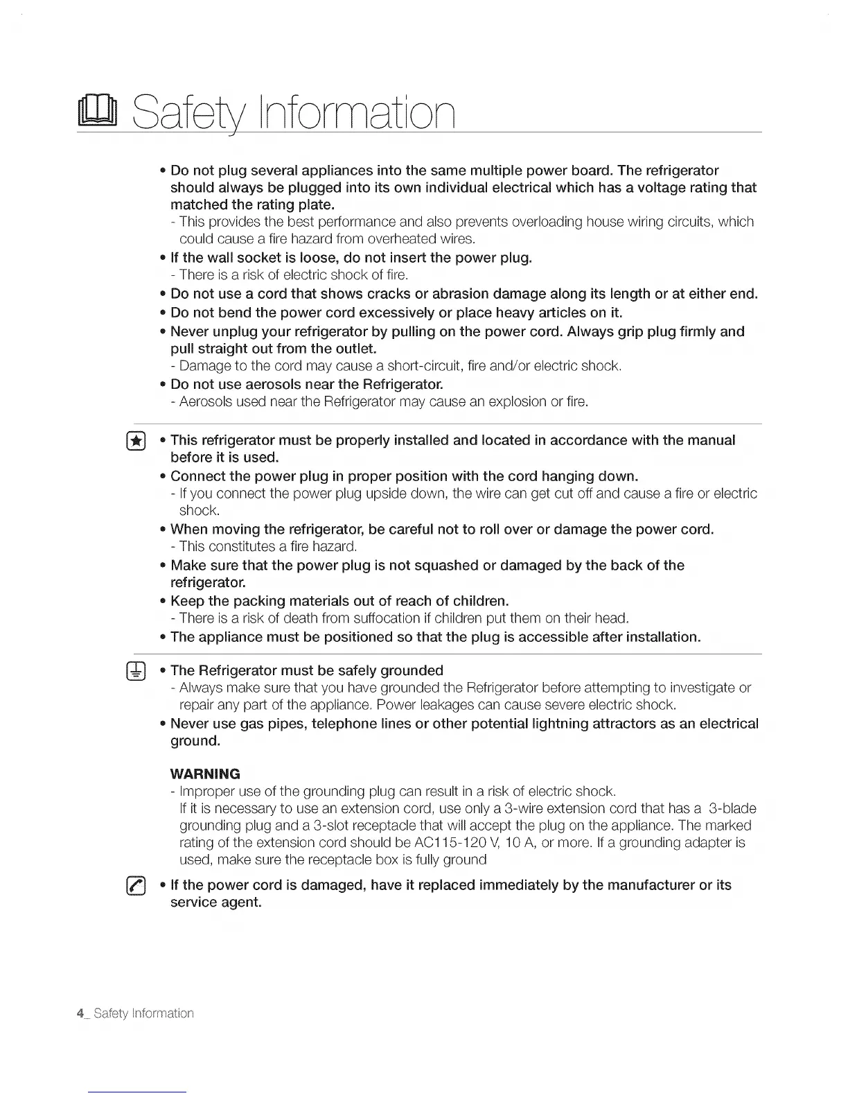 - Always make sure that you have grounded the Refrigerator before attempting to investigate or