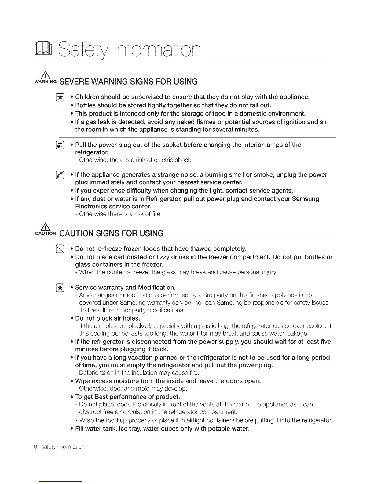,, If any dust or water is in Refrigerator, pull out power plug and contact your Samsung