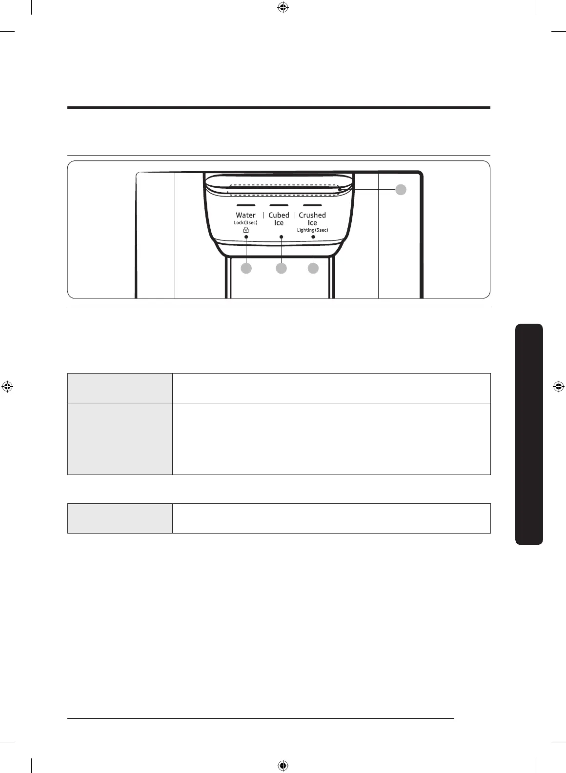 01 Water (Agua) / Lock (Bloqueo) 02 Cubed Ice (Hielo en cubos)