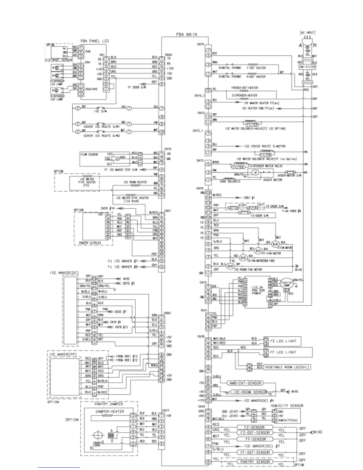 Samsung RF261BEA - Main Board Wiring Diagram; Panel LED and Main Board Connections; AC Load and Heater Wiring; Motor and Sensor Wiring