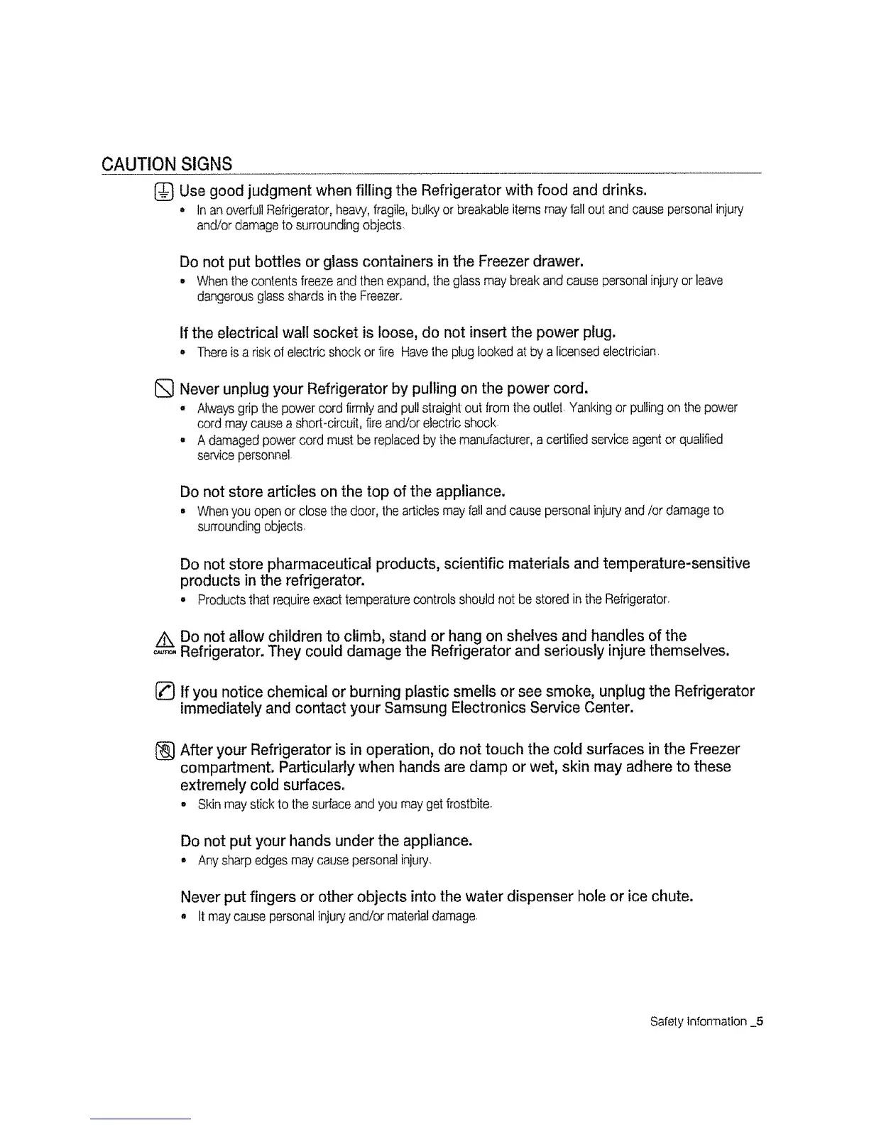 After your Refrigerator is in operation, do not touch the cold surfaces in the Freezer