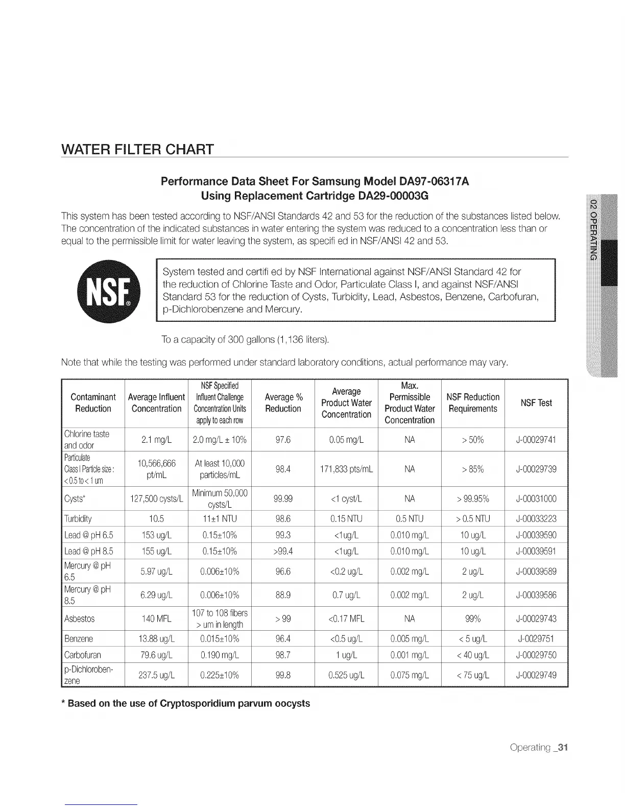 This system has been tested according to NSF/ANSI Standards 42 and 53 for the reduction of the substances listed below.