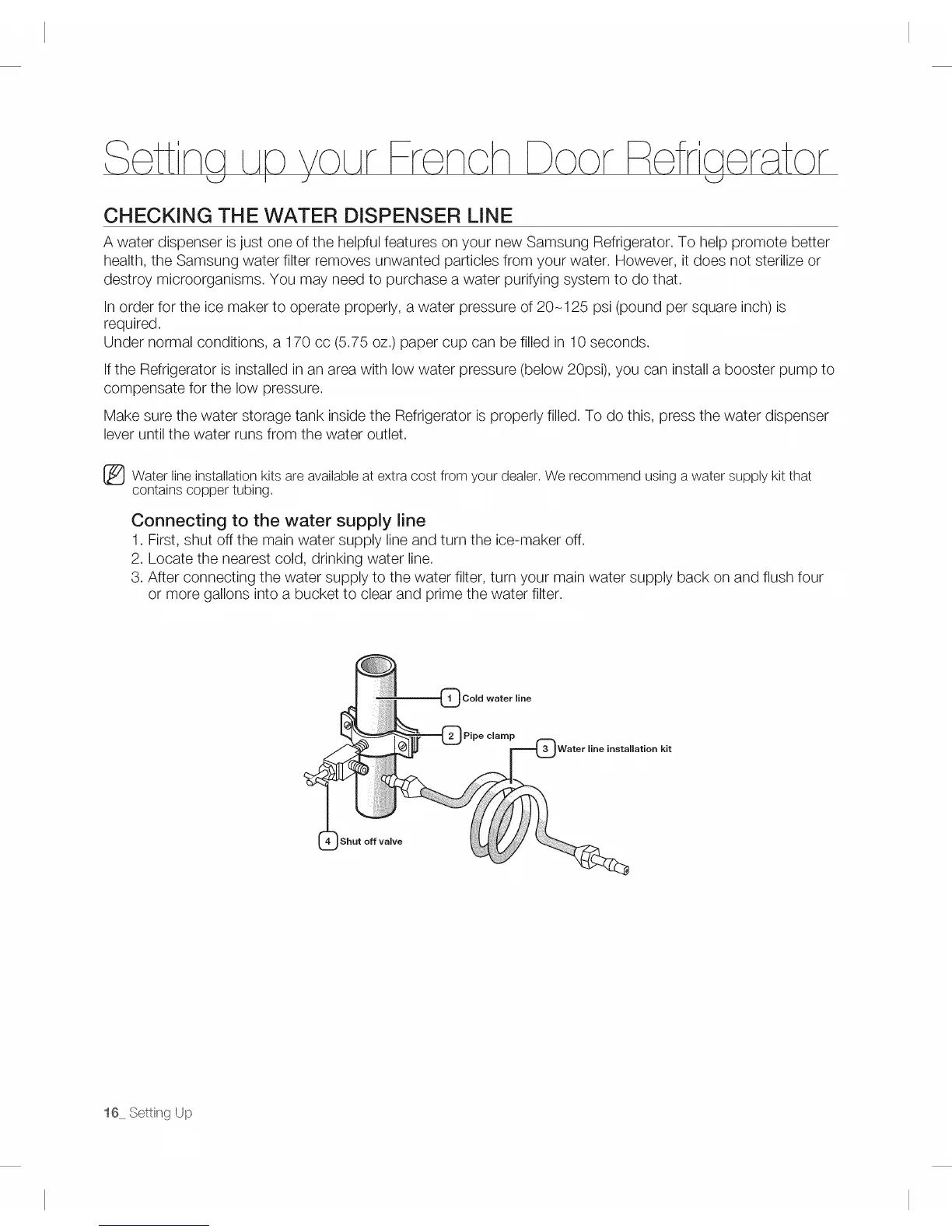 If the Refrigerator is installed in an area with low water pressure (below 20psi), you can install a booster pump to