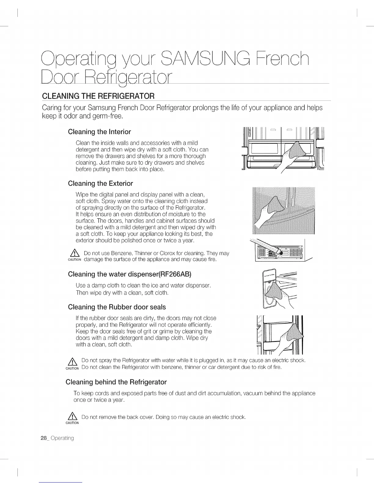 CAUTIONDOnot clean the Refrigerator with benzene, thinner or car detergent due to risk of fire.