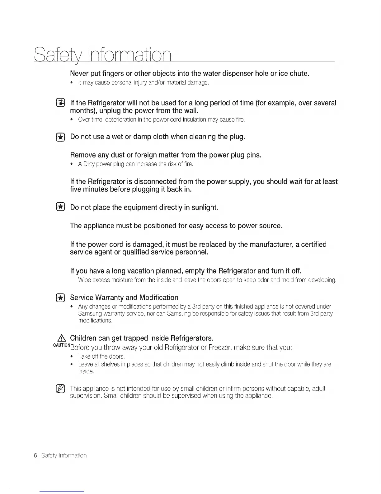 Never put fingers or other objects into the water dispenser hole or ice chute.