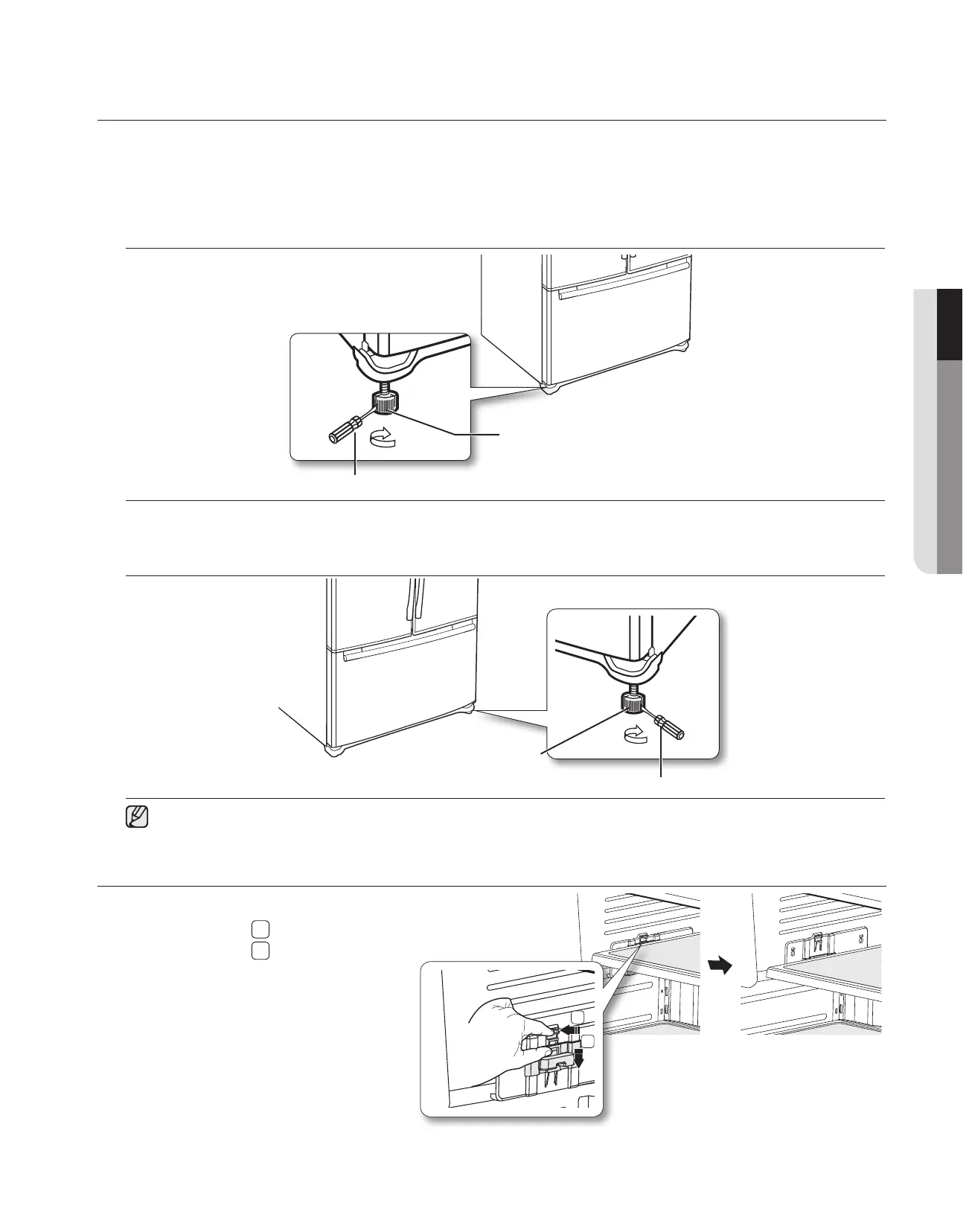 make final adjustments. If the Refrigerator is not level, it will not be possible to get the doors perfectly even.