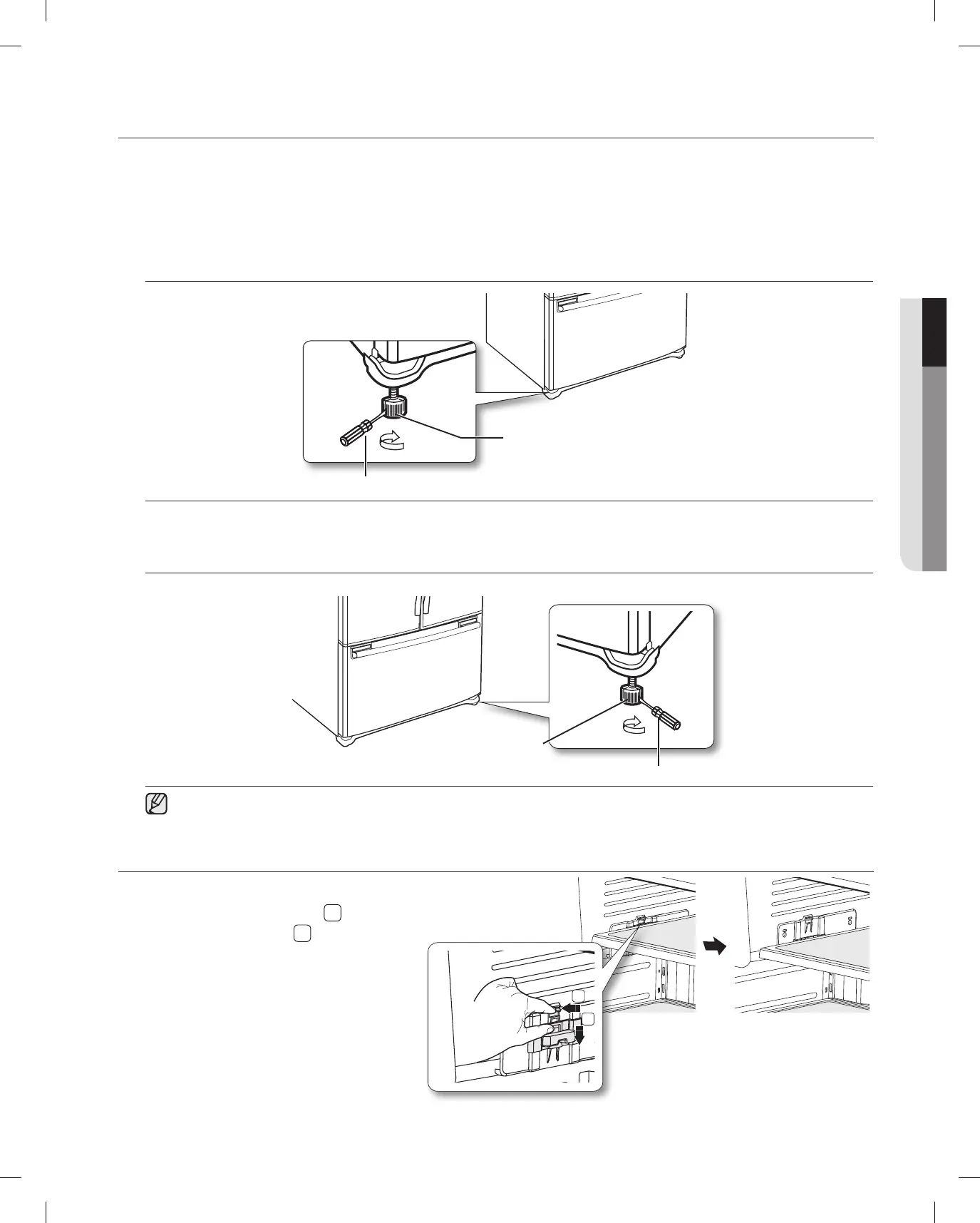 Introduzca un destornillador plano dentro de una ranura del pie de nivelación derecho y gírelo en sentido
