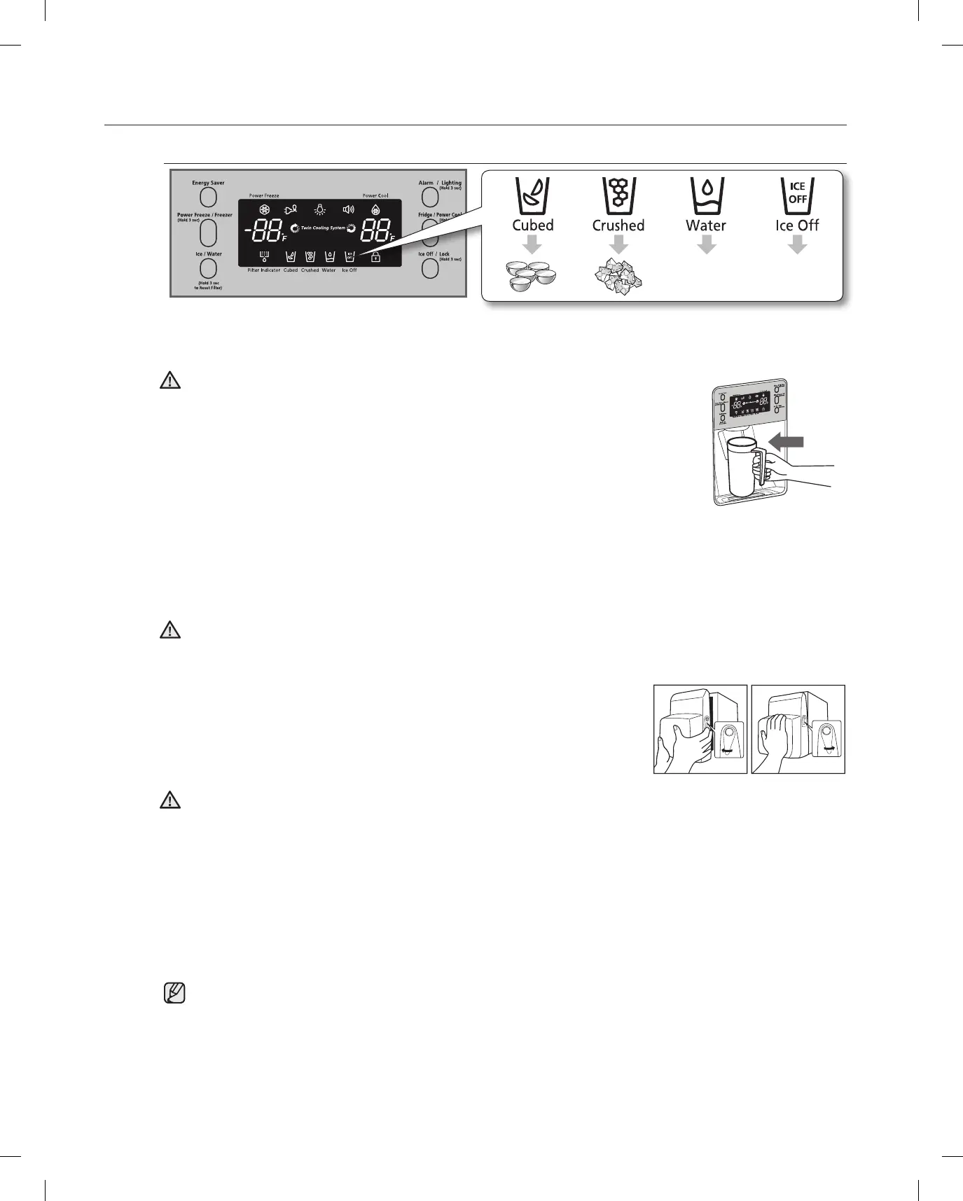 Coloque un vaso bajo el dispensador de hielo y pulse, con él, la palanca del dispensador cuidadosamente.