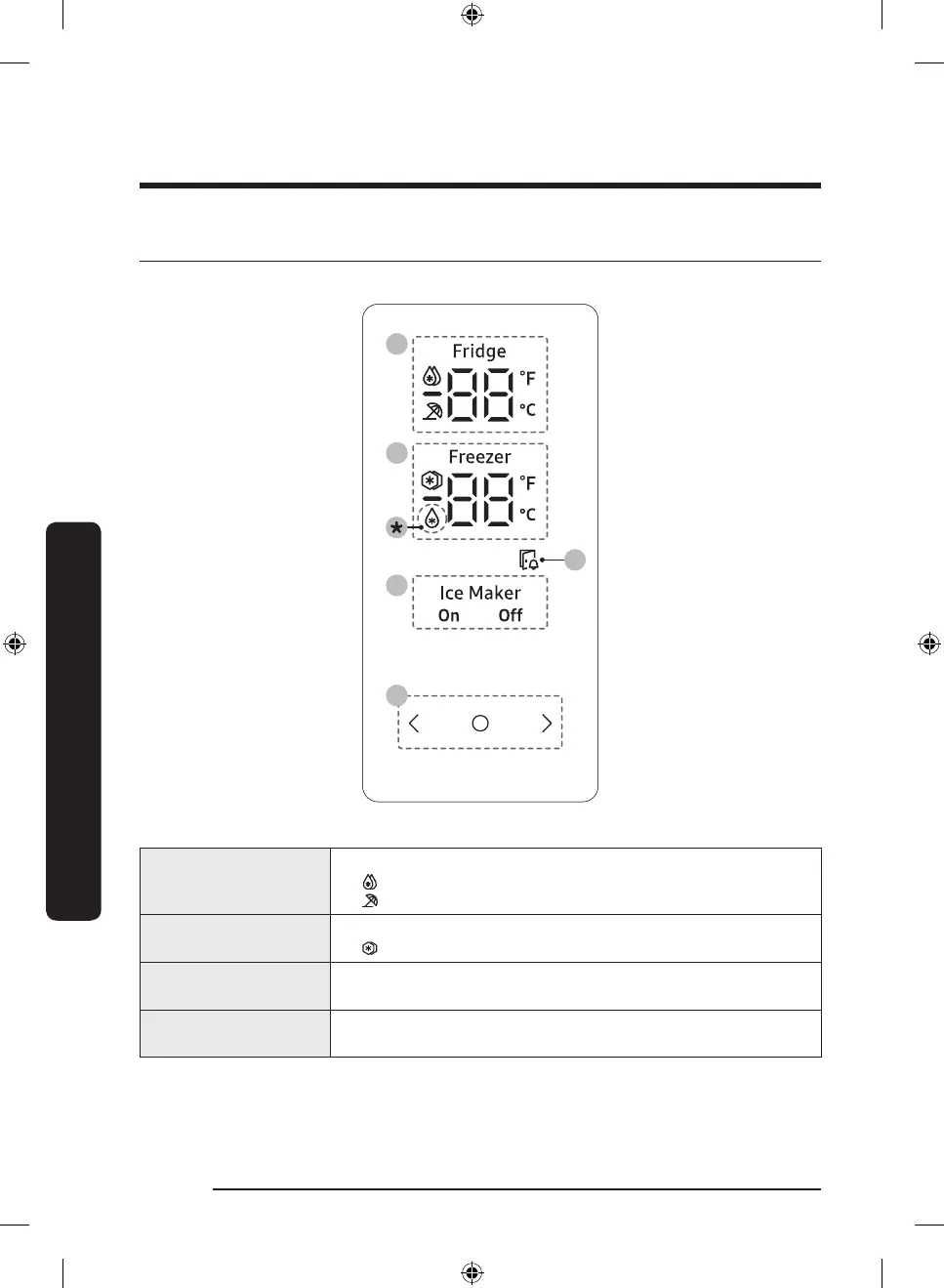 • Displays the current or desired temperature of the fridge.