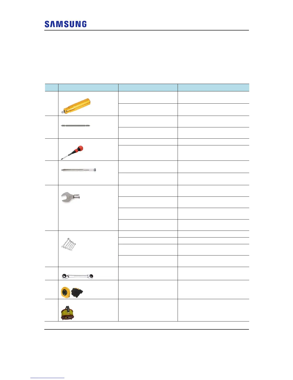 The basic tools required for installation are listed in the following table. The