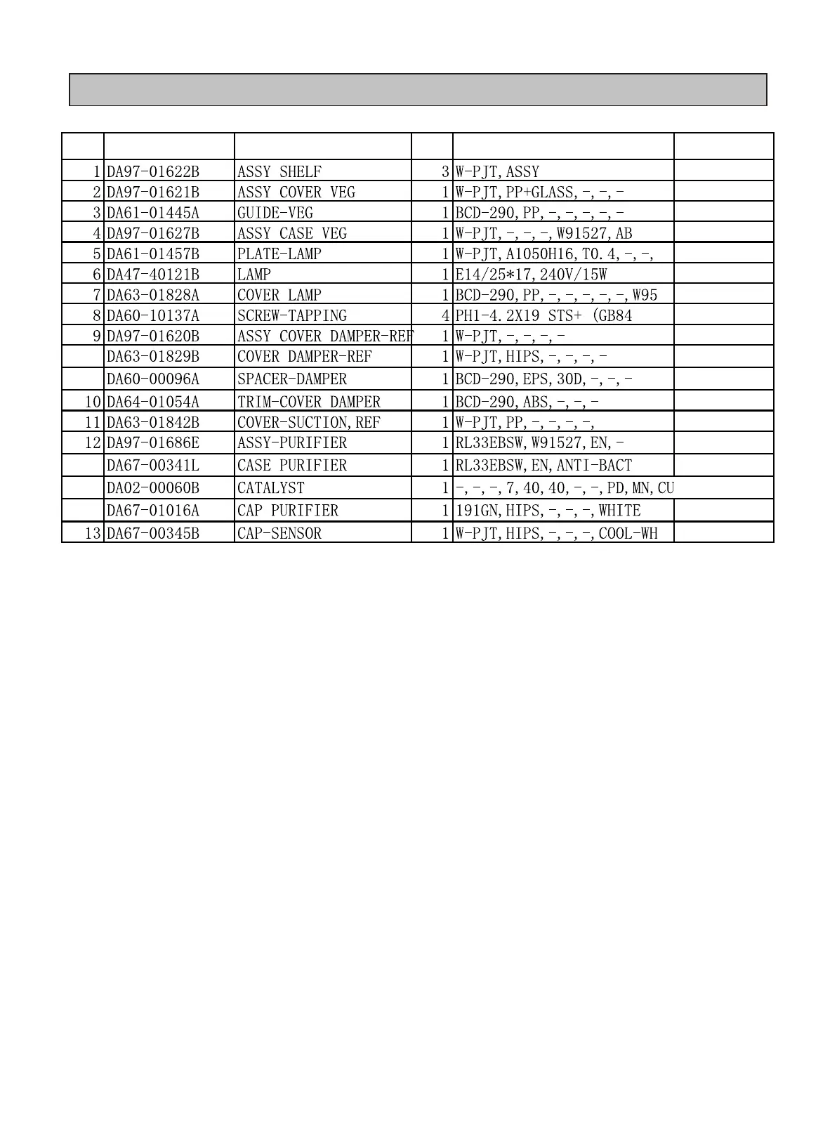 No Part number Description Q'ty Spec Remark